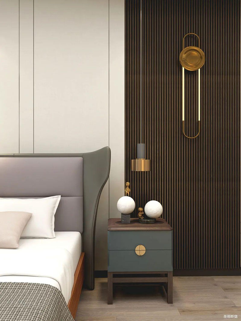 臥室精簡有致,從質(zhì)感出發(fā),打造由內(nèi)而外的優(yōu)雅奢華感。背景墻、地板、地毯均擁有較強的肌理感,在加上金屬軟裝飾物調(diào)和,讓空間在低調(diào)內(nèi)斂的基礎(chǔ)上又不失時尚的高級感,飄窗進階為溫馨的一角,閑暇時,則可倚窗而坐,品一杯紅酒,感受生活中的愜意時光。