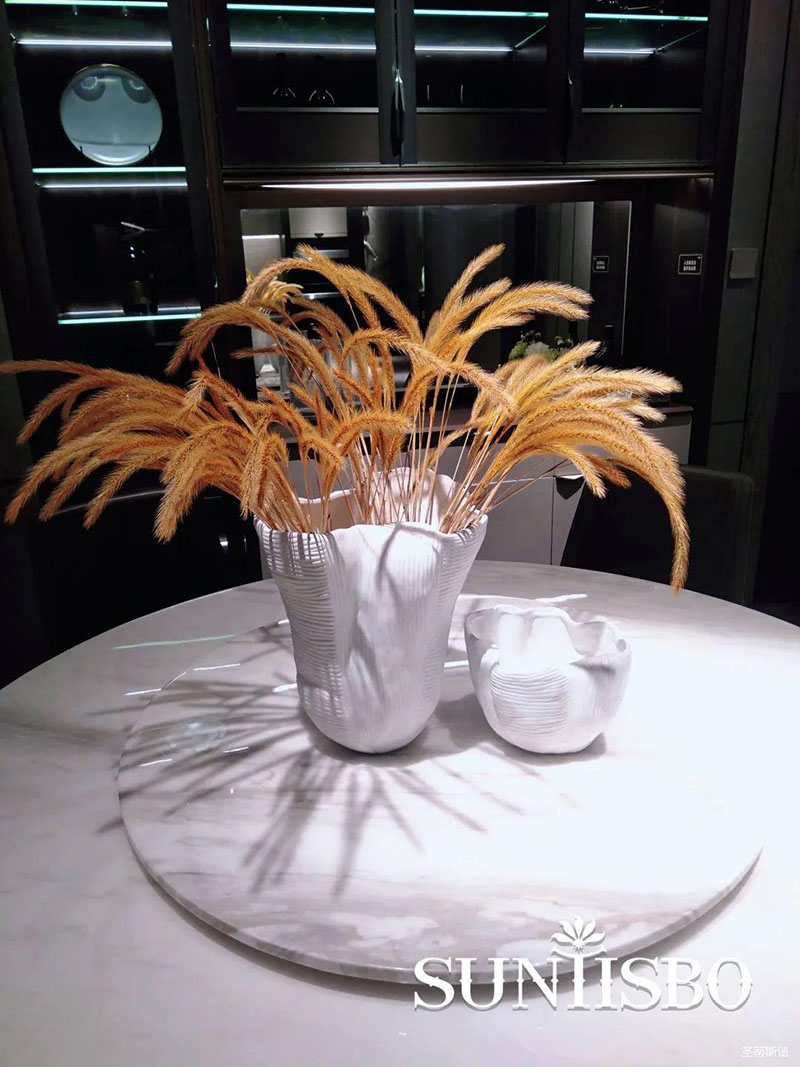 3.輕奢的配飾也需邀來似錦繁花相稱。色彩跳脫的植物更為亮眼,讓自然界的色彩與姿態(tài)應(yīng)和空間之間的協(xié)調(diào),傳遞空間與情感的共鳴。