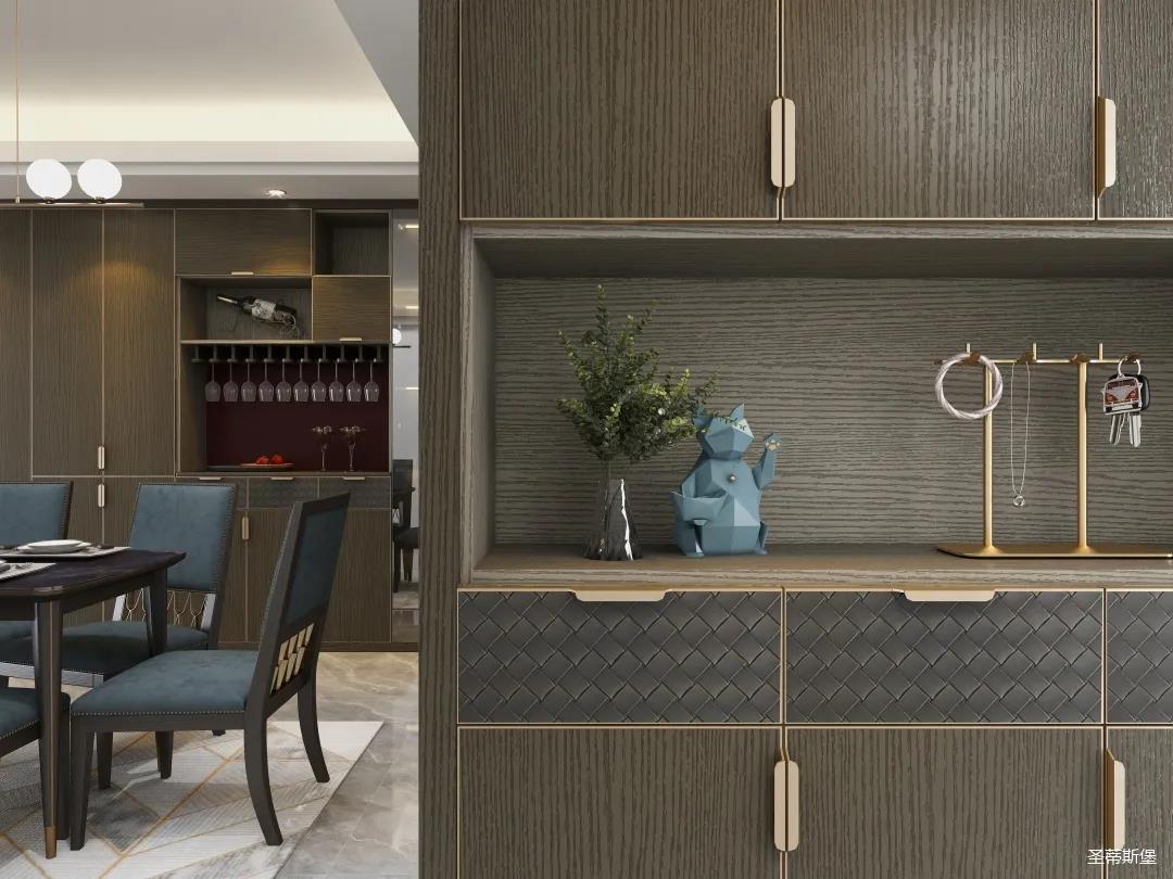 材質(zhì)的交替與光影的變換,具有濃濃的現(xiàn)代簡奢色彩。獨(dú)一無二的英倫爵士灰定制柜,由延邊鑲嵌的香檳金拉絲金屬分割,線條流暢且奢華,不僅代表著時(shí)尚,也崇尚了實(shí)木韻味。設(shè)計(jì)師將現(xiàn)代、實(shí)用、精致的藝術(shù)設(shè)計(jì)風(fēng)格應(yīng)用其中,更是精致生活方式的藝術(shù)演繹。在平靜的空間中表現(xiàn)出獨(dú)特的藝術(shù)骨感,滿足我們對(duì)精致生活的精神追求。