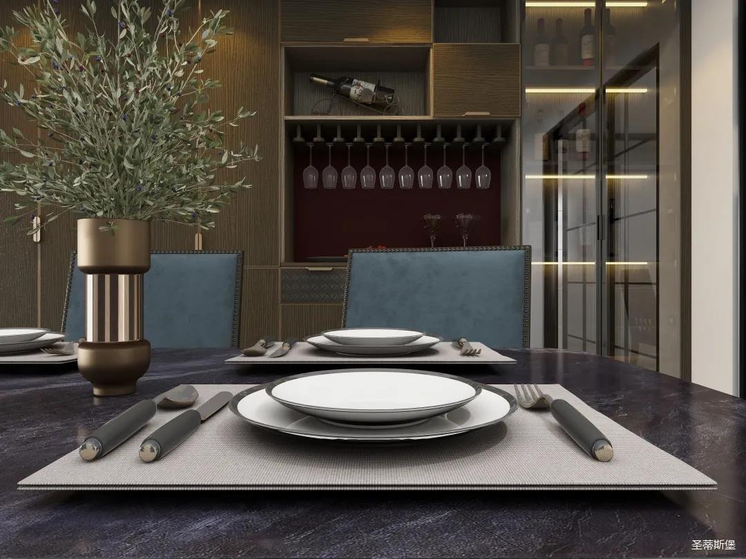 餐廳系統(tǒng)詮釋著材質(zhì)與工藝的質(zhì)感結(jié)合。一字型定制餐邊柜,實(shí)木飾面細(xì)膩?zhàn)匀唬尵筒涂臻g成為了高級(jí)情調(diào)的重點(diǎn)。明暗分區(qū)的設(shè)計(jì)構(gòu)造,順勢創(chuàng)造了更多的儲(chǔ)物驚喜。