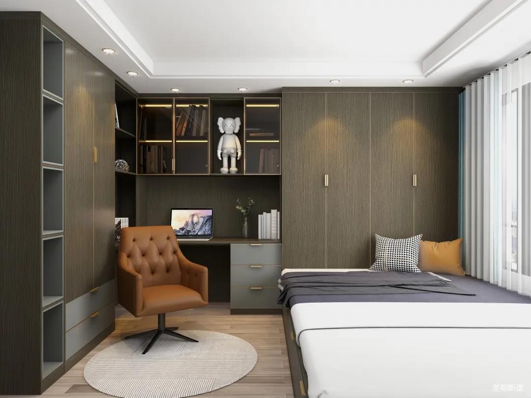 別具一格的定制,都是通過高級(jí)材質(zhì)與色彩來展現(xiàn)極簡摩登生活。一字型衣柜+書桌設(shè)計(jì),打造了“簡而不減”的別致空間。深邃的灰色系定制為空間注入現(xiàn)代都市風(fēng)情,在品位簡約中彰顯奢華氣質(zhì)!
